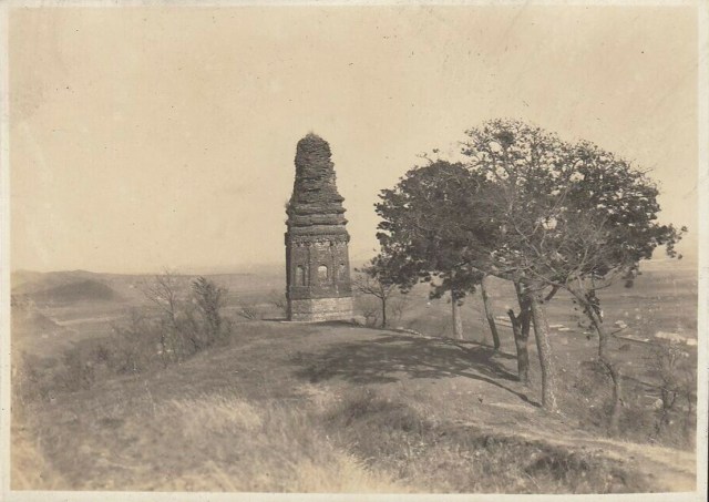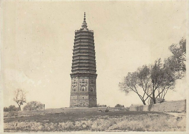 名称: 沈阳塔湾舍利塔 类别: 银盐照片 日期: 1920-1930年代 尺寸: 10 x 15厘米 备注:沈阳塔湾舍利塔位于沈阳市皇姑区塔湾街的黄土高坡上,建于1044年(辽重熙十三年),清崇德六年重修。因佛塔内供藏1548颗“舍利子”,所以又称无垢净光舍利塔。