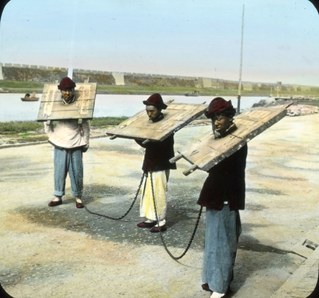 这时,租界的宽阔大道上迎面来了三位戴着木枷的囚犯,这种用厚实的木板制作的木枷中间挖了一个可以套住颈脖的洞,分可成两半,合便成一板,中间有木扣相联,并在两个半块的合缝处贴上封条,以防止犯人随意卸下木枷,戴上木枷的犯人即可防止其逃逸,更是一种耻辱的标志,这三位戴着木枷的犯人可能有是在押解的途中。三位戴枷的犯人还有铁链相串联在一起,利卡尔顿对清帝国的这种刑罚极为好奇。他把镜头对准了这三位走在租界大道上的清国罪犯,三位清国的囚犯面对照相机的镜头有泰然的,有羞涩的,也有蔑视的,镜头将三位囚犯的内心世界表现得极为丰富。