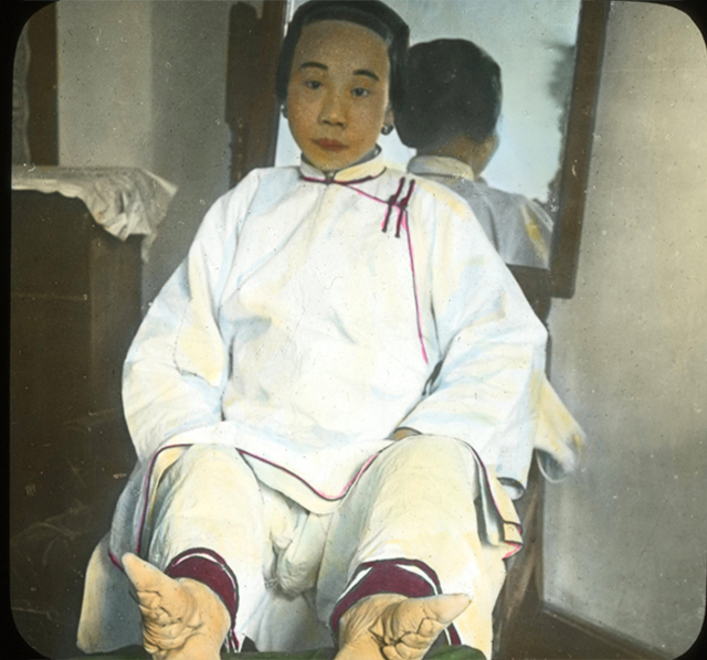 描述: 为了拍摄“三寸金莲”——中国妇女的小脚,利卡尔顿请一位上海妇女做模特。这位妇女有良好的教养,但家道中落,面对洋人的镜头,她显得相当镇静,应是见过些世面。拍摄在一家饭店的房间里进行,利卡尔顿让她坐在镜子前面,直视镜头,双脚向前伸出,这样,既能拍到小脚又能拍到脸,镜子中还可以看到背影。拍摄时,这位妇女的母亲就陪在旁边。随后,利卡尔顿不厌其烦地重复了中国妇女裹脚的历史。