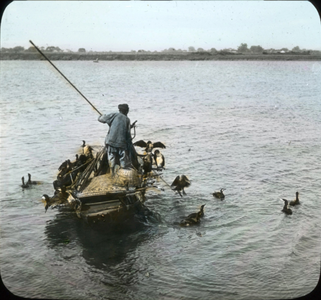 名称: 苏州河上的渔民 类别: 玻璃底片(手工上色) 日期: 1900年 尺寸: 11 x 9厘米 描述: 据利卡尔顿说,他还在广州的时候就收到U&U总部的来信说一定要拍到“鱼鹰”的照片。他虽说对这种能够帮人捉鱼的水鸟有所耳闻,但是他也从未见过,而且对这种事情持怀疑态度。在收到公司的信后他询问了当地人,有人告诉他要沿着长江进入中国内陆很远才有“鱼鹰”。他顺着京杭大运河而上,在苏州附近就看到了这种水鸟,结果还闹了笑话。他扛着相机沿着运河边追着渔船拍照,可渔夫看着有老外追倒吓了一跳,撑船就跑,追了好远,借助翻译,给了两个渔夫一大笔钱才勉强同意拍摄……。我们今天猜测利卡尔顿所提到拍摄鱼鹰的湖面应该是在同里镇附近的湖中岛——罗星洲,同里湖面烟波浩淼,渔船携带鱼鹰湖面上扑鱼。