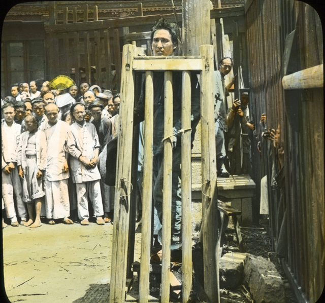 描述: 上海街头关在站笼里的死囚张掌华,这种特制的木笼上端是枷,卡住犯人的脖子;脚下可垫砖若干块,痛苦的程度和苟延性命的长短,全在于抽去砖的多少。笼中的死囚是一个杀死多人的河盗张掌华。