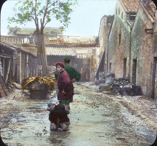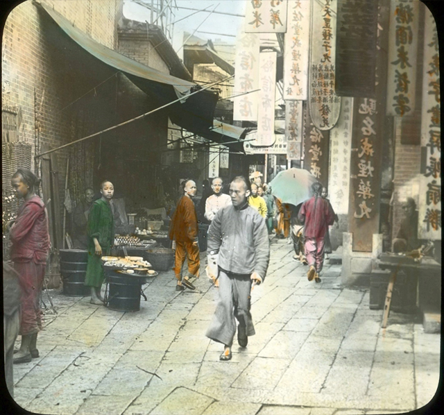 名称: 广州街头 类别: 玻璃底片(手工上色) 日期: 1900年 尺寸: 11 x 9厘米