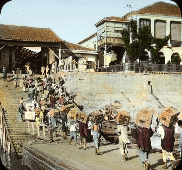 名称: 天津码头的民工 类别: 玻璃底片(手工上色) 日期: 1900年 尺寸: 11 x 9厘米 描述: 1900年夏,八国联军攻占天津后,开始着手准备进攻北京。大批军用物资源源不断运往天津码头,联军雇雇佣当地人(日薪20美分)推三轮车运载物资工随军队向北京开拔。星条旗下,即是美军军需总部。据利卡尔顿记载;在天津法租界的海河边,每天都会有大量的尸体和残肢从上游漂下来,少数是被义和团残杀的教民,多数都是俄国军队残杀的百姓,按利卡尔顿说法是俄军行进路线上不可能有活物。