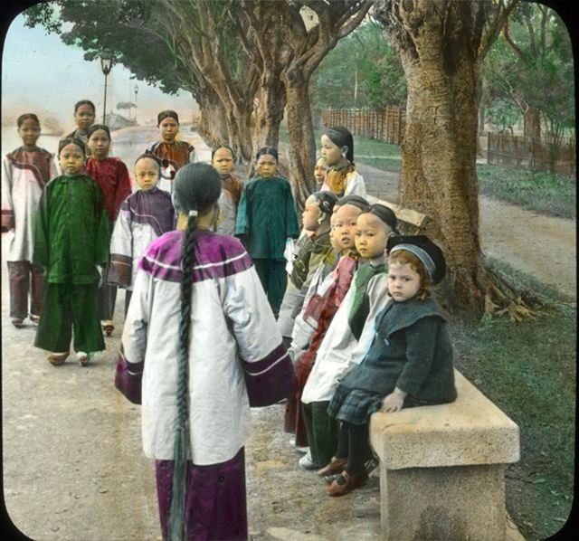 名称: 教会儿童和一个美国小女孩儿在一起 类别: 玻璃底片(手工上色) 日期: 1900年 尺寸: 11 x 9厘米 描述: 1900年初,利卡尔顿摄于广州沙面的一幅照片。他这样记述:外国领事馆的房子都修建在这个岛(沙面)上。一群教会儿童正聚在一棵高大的榕树下。这些衣着漂亮的女孩属于比较富裕的阶层。河边那个女孩的脸上显露着幸福的笑容,这在中国是少见的情景。她们的外套很优雅,宽大的袖子,领口处还装饰着一条简单的花边,至少有一个女孩把头发结在脑旁,这种发型在中国的小女孩身上很常见。