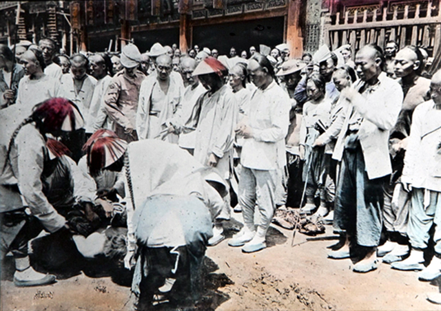 描述: “庚子事变”后,慈溪将失败的责任推给义和团,大批义和团成员在菜市口刑场被杀害。八国联军以及清政府官员,和一群麻木围观的当地百姓围观处决义和团场景。