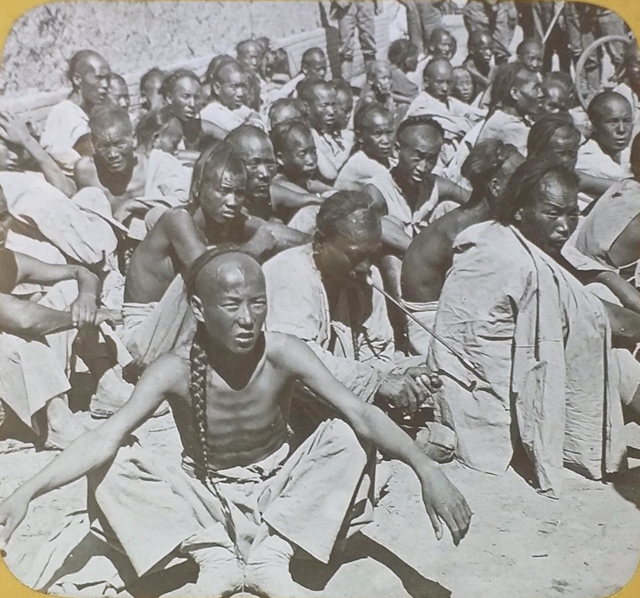 名称: 囚犯 类别: 玻璃底片(手工上色) 日期: 1900年 尺寸: 11 x 9厘米 描述: 摄影师利卡尔顿和向导(翻译)乘船沿运河来的苏州,当他走上洋关门外租界新拓宽的东西大道上,看着隔河高高的城墙时,心上油然升起探秘这座文明古城的强烈愿望。他带着照相设备上了岸,登岸的利卡尔顿首先拜访了洋关和公共租界上的美国朋友和欧洲朋友,他的美国朋友福开森刚好在苏州海关工作。福开森是中国通,福开森向他介绍了苏州的风土人情,向他提供了采访拍摄的意见。利卡尔顿在洋关美美地喝了一杯浓香的咖啡,当他走上洋关门外租界新拓宽的东西大道上,看着隔河高高的城墙时,心上油然升起探秘苏州这座文明古城的强烈愿望。 这时,租界的宽阔大道上迎面来了三位戴着木枷的囚犯,这种用厚实的木板制作的木枷中间挖了一个可以套住颈脖的洞,分可成两半,合便成一板,中间有木扣相联,并在两个半块的合缝处贴上封条,以防止犯人随意卸下木枷,戴上木枷的犯人即可防止其逃逸,更是一种耻辱的标志,这三位戴着木枷的犯人可能有是在押解的途中。三位戴枷的犯人还有铁链相串联在一起,利卡尔顿对清帝国的这种刑罚极为好奇。他把镜头对准了这三位走在租界大道上的清国罪犯,三位清国的囚犯面对照相机的镜头有泰然的,有羞涩的,也有蔑视的,镜头将三位囚犯的内心世界表现得极为丰富。