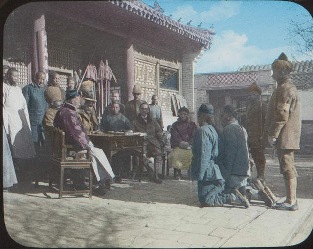 名称: 八国联军北京街头军事法庭 类别: 玻璃底片(手工上色) 日期: 1900年 尺寸: 11 x 9厘米 描述: 入城之初,八国联军即的北京城内屠杀义和团和普通民众,仅在庄王府一处即杀团民1700多名,甚至凡遇中国人就放枪击杀。法军将一群中国人逼到一条死胡同里扫射15分钟,直到没有一个活人为止,使馆人员也以个人为快事,进行杀人竞赛。北京街头尸积如山,联军驱逐华人清理处尸后,又把清理者全部击毙。
