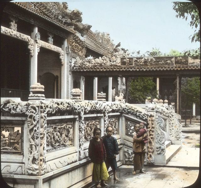 名称: 陈氏书院(广州) 类别: 玻璃底片(手工上色) 日期: 1900年 尺寸: 11 x 9厘米 描述: 陈氏书院或陈家祠堂,是广东现存规模最大、保存最完整、装饰最精美的中国清代宗祠建筑。建于清光绪十四年(1888年),建成于光绪二十年(1894年),由当时广东省72县陈姓人氏合资兴建,主体建筑为五座三进、九堂六院,以大门、聚贤堂和后座为中轴线,通过青云巷、廊、庑、庭院,由大小19座建筑组成建筑群体,各个单体建筑之间既独立又互相联系。祠内现仍可见精美建筑及其遍布在祠堂内外的木雕、石雕、砖雕、泥塑、陶塑、铁铸工艺等装饰物件。书院现为广东民间工艺博物馆。2002年以古祠留芳为名入选新世纪羊城八景。