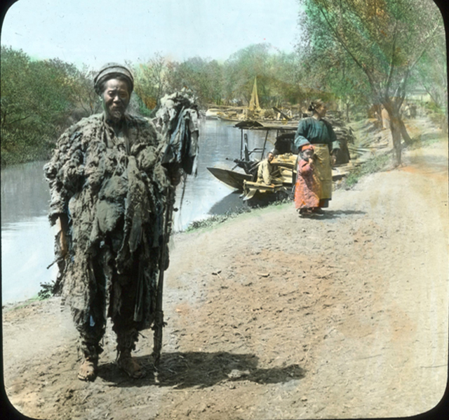 名称: 上海乞丐王 类别: 玻璃底片(手工上色) 日期: 1900年 尺寸: 11 x 9厘米 描述: 照片的后方是上海龙华寺,你还能看到部分塔身。挡在镜头前的是这一带很有名的乞丐王,龙华寺一带的乞丐都归他管理。他身披破烂不堪的衣服,以此为荣,似乎积极地等候为他拍照。